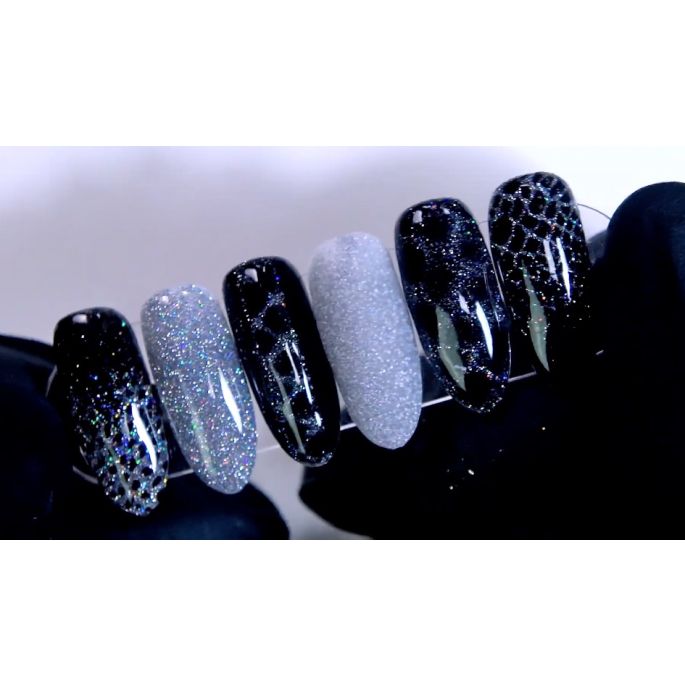 - Breng vervolgens de Reflective Gel Polish nummer 1 best wel ruim aan, zodat hij de zwarte gellak best wel afdekt. Werk vanaf de bovenzijde van de nagel en blend het laatste stukje naar beneden uit; zodat het een soort van ombre-effect krijgt.