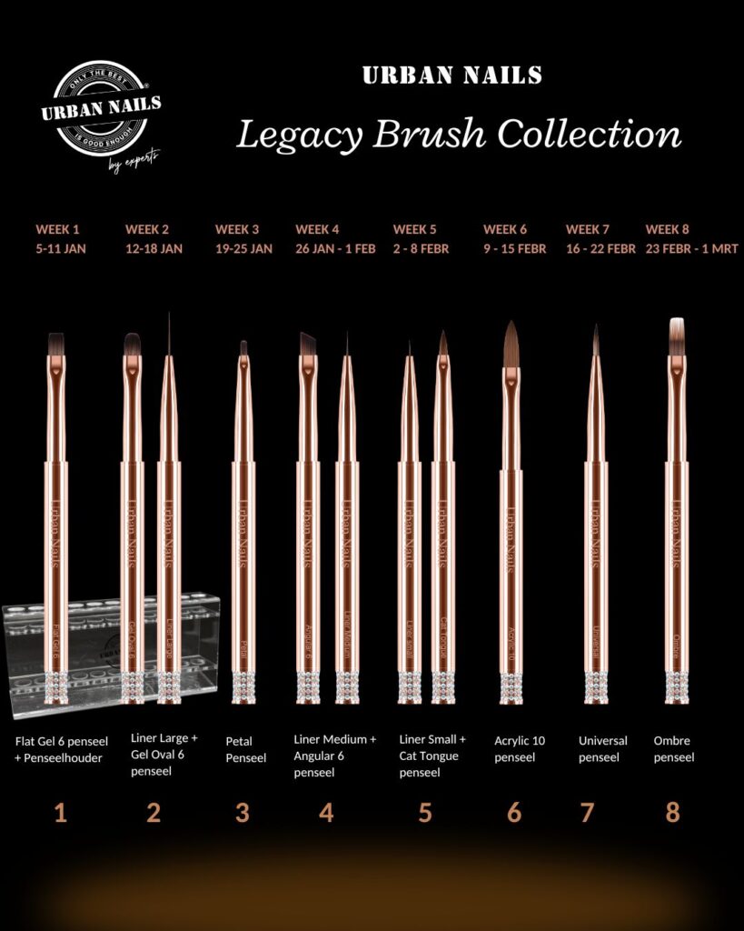 Het regent cadeautjes - en dat houdt niet op na kerst! Verzamel vanaf 5 januari alle 11 Legacy Brush Penselen mét luxe houder en ontvang bij je bestelling vanaf 150 euro, exclusief btw, een luxe en limited edition penseel cadeau. Acht weken lang is er wekelijks een nieuw penseel te krijgen en demonstreren we het penseel van de week - live - in de besloten facebookgroep van Urban Nails.