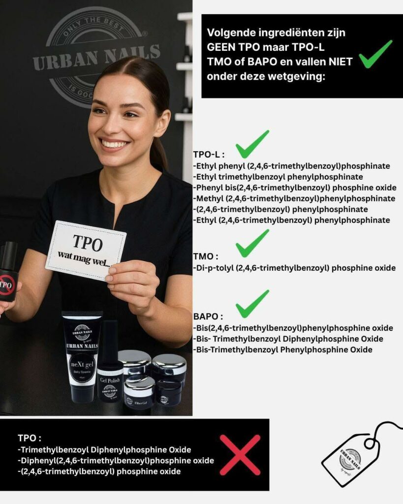 Staat één van deze omschrijvingen op je etiket? Dan mag het na 1 september 2025 niet meer gebruikt worden. Scroll snel verder voor meer informatie, want je kunt je TPO-houdende producten in de winkel van Nagelinkoop.nl inruilen voor hoge korting. Let op: het TPO-verbod geldt níet voor TPO-L, TMO en/of BAPO, dus check de labels goed.