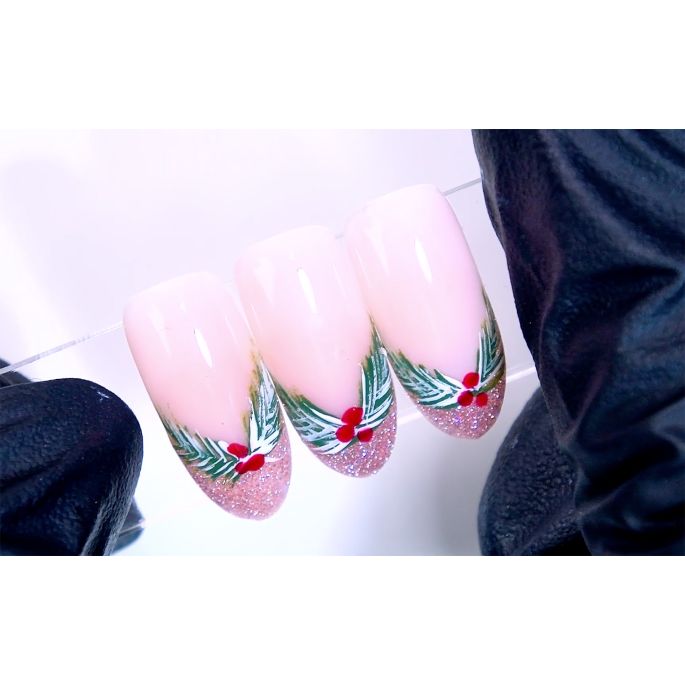 - Voor de kersttak of kerstkrans gebruik je art gel nummer 41 en nummer 10. Begin met de groene art gel 41. Zet een nonchalante French, want dat wordt de basis van de tak. Je kunt ze ook heel makkelijk de hand van de klant even draaien, dan zit je er soms beter voor. Zet vervolgens nonchalante lijnen voor de tak.