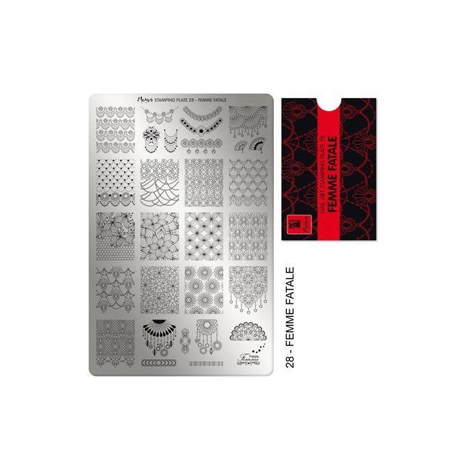 De Stamping Plate 28 Femme Fatale van Moyra is van de beste kwaliteit en geschikt voor leuke nailart op zowel de natuurlijke als de kunstnagel. Deze stempelplaat kan worden gebruikt met stempelgel, stempellak, pigmenten en pastagel. De stempelplaat bevat diverse printen die oneindig kunnen worden gebruikt.