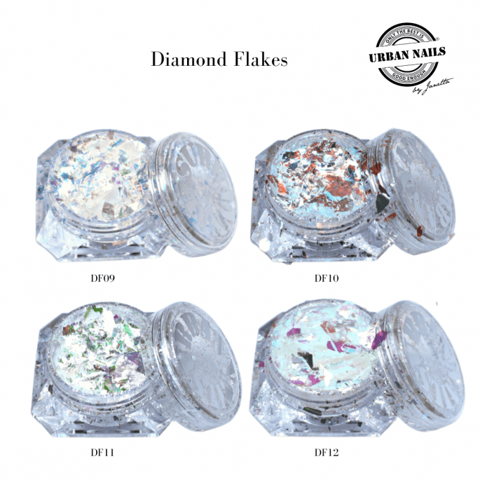 De flakes worden geleverd in een luxe diamant vormig potje en een doosje. De verpakking bevat 1gr. Verkrijgbaar in 15 verschillende kleuren.
