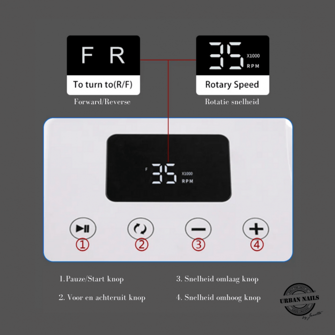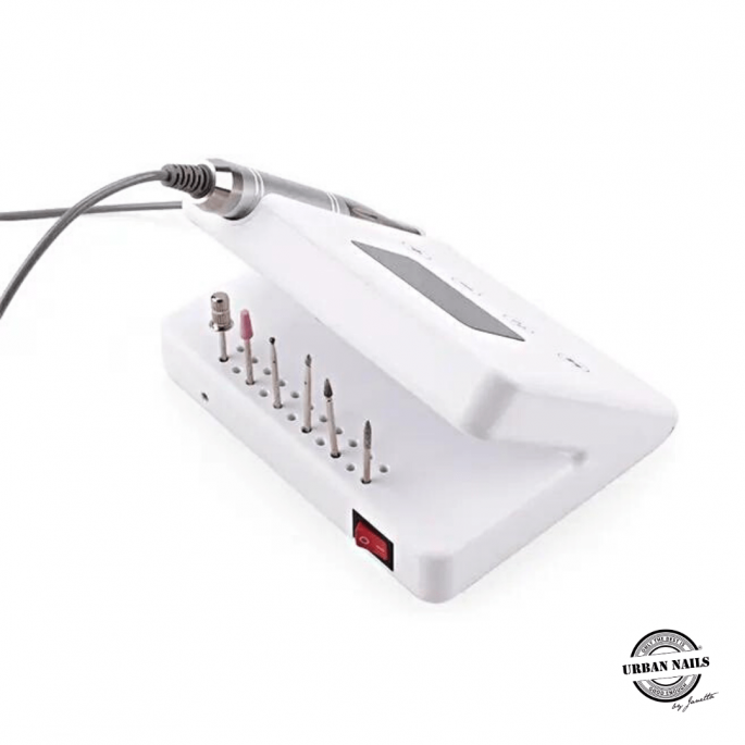 De Urban Nails Nagelfrees Nail Drill is een zeer compacte nagelfrees en is gemakkelijk om mee te nemen. Deze Urban Nails Nail drill is ideaal voor starters maar ook zeer geschikt voor de gevorderde nagelstylisten. Deze elektrische vijl kan zowel links- als rechtsom draaien en kan worden bedient met de hand. Deze zeer betaalbare en kwalitatieve elektrische nagelvijl is bijna geluidloos en de vibratie is minimaal wanneer deze in gebruik is. De snelheid kan aangepast worden tot maximaal 35.000 toeren. De bitjes kunnen worden opgeborgen in de daarvoor bestemde gaatjes aan de achterkant van het apparaat. Hierdoor zijn de bitjes altijd binnen handbereik. Het twistlock handstuk kan perfect worden geplaatst in het apparaat.